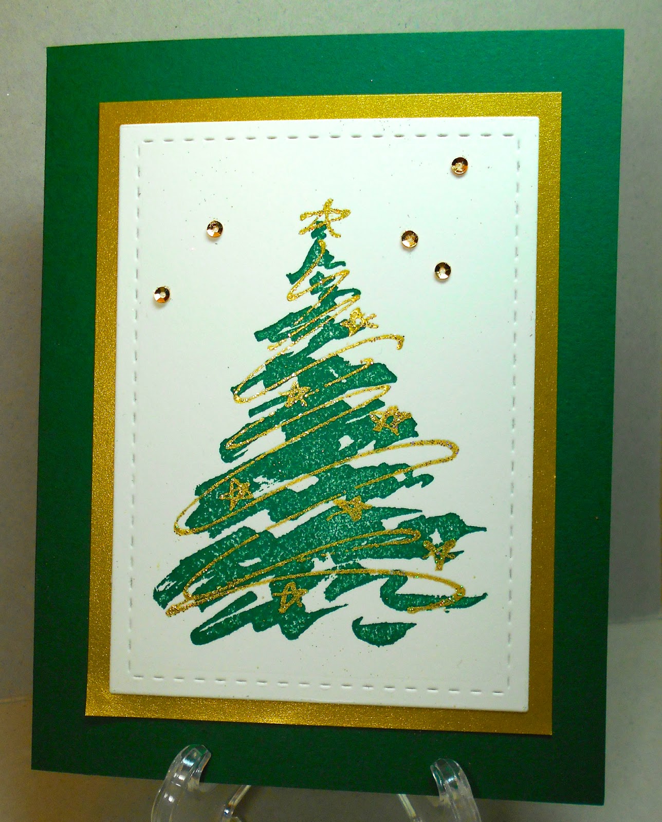 The green part of the tree is stamped with a dye ink, the gold part with a pigment ink with sparkly gold embossing powder added. I took many photos but could not get one that really showed the sparkle.