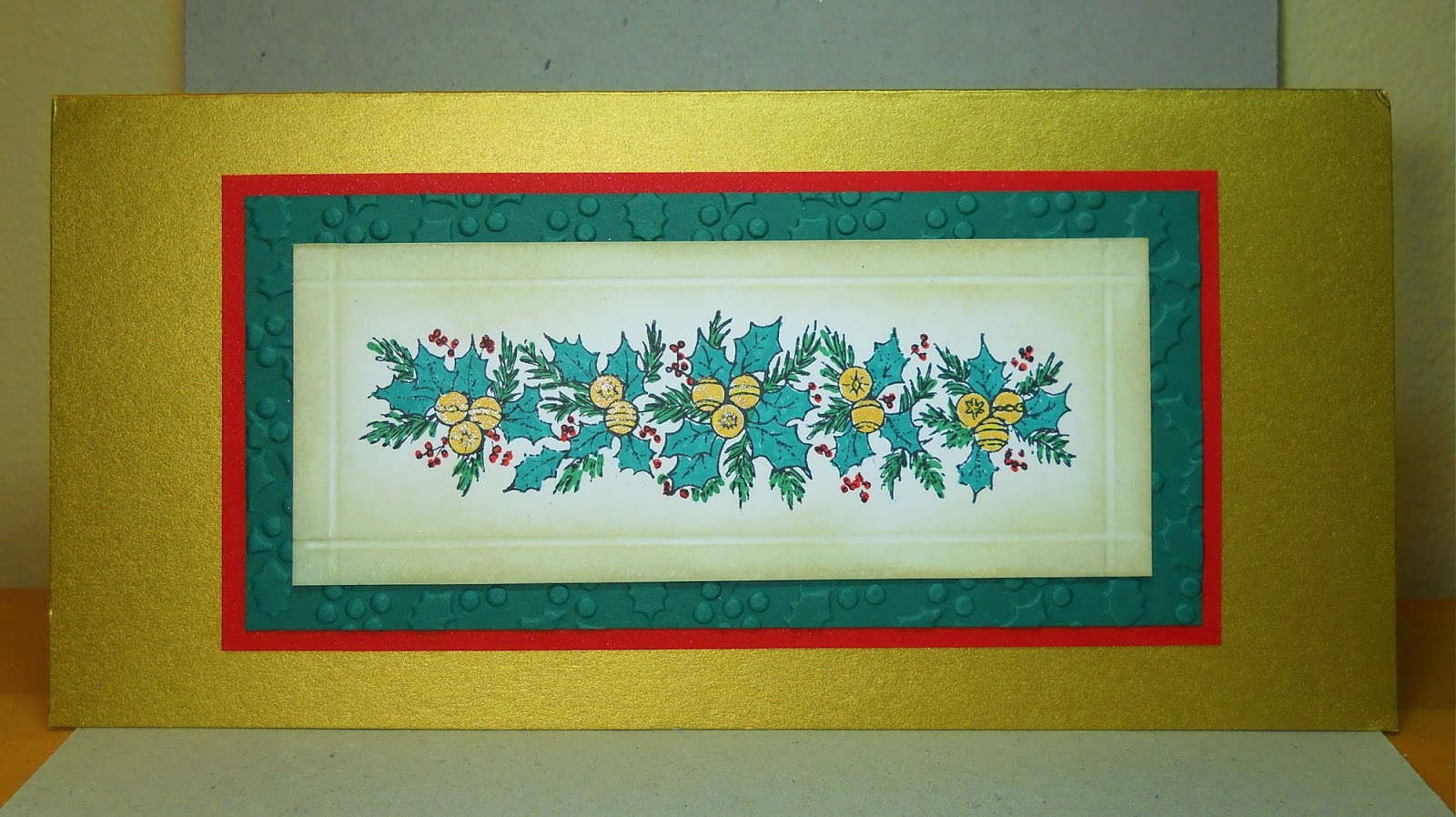 ReplyDeleteLove the long narrow cards and that pretty holly border! All that gold makes them so elegant!
