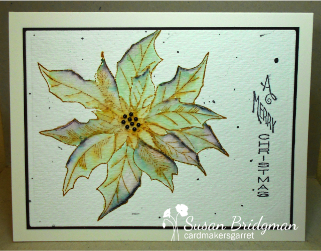 For this version, I masked the poinsettia, added a bit of black splattering and a sentiment, and left it at that. I like this version as well and it's a cleaner look, but the text stamping adds some texture that I feel is lacking in this one, and also enhances the vintage look created by the Elegant Writer.