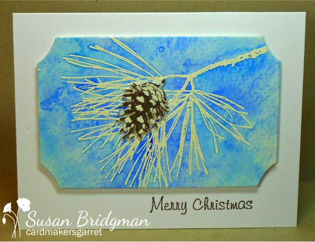 LOVE this card Susan. Your watercoloured background is beautiful!! Love the snow covered branch and your snowy pine cone. Great design! xx