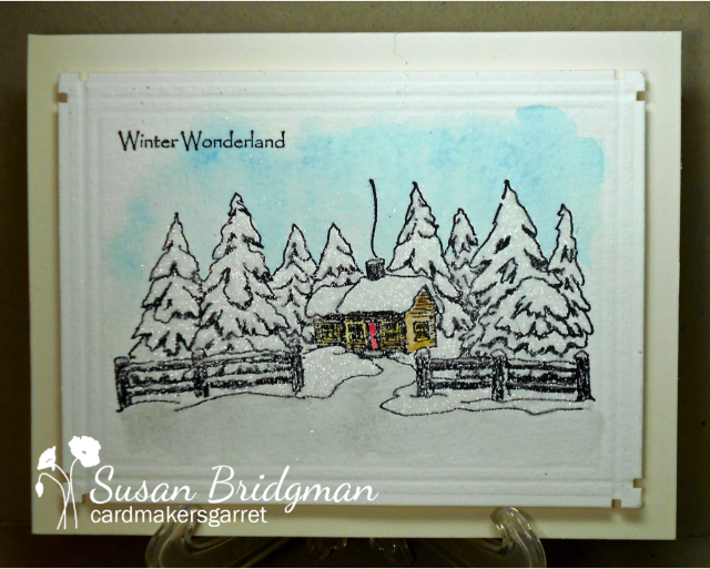 What a beautiful, snowy scene, Susan! I love the warm, cozy cabin nestled in the shimmery snow! Love how you've framed it too! The corner punch along with the scoring is classy!