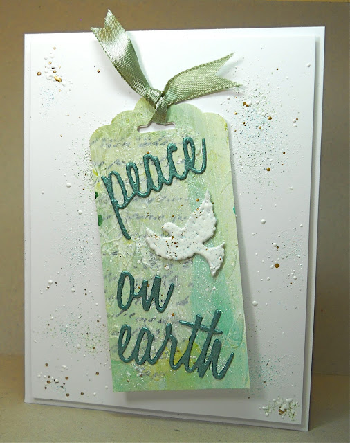 | Accessories: Tim Holtz Peace on Earth die, Memory Box dove die, green ribbon, green and blue acrylic paint, gesso, Stampendous Frantage (Shabby Green, Shabby Blue, and Chunky White), SU tag punch, harlequin stencil, clear paste, dimensionals |