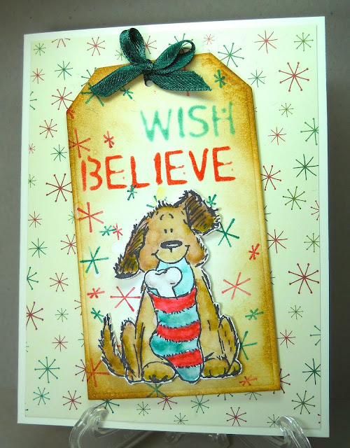 I then went on and made another tag with the same stamp, but this time, fussy cut the dog, and stencilled the sentiment on the tag, sponged it for a more rustic look, and mounted it on a dp background. I had another star cluster stamp that I coloured with red and green markers and stamped on the tag to reflect the dp. Once I'd put it together, I had second thoughts and now feel it's a bit of overkill on the stars - I like things more CAS. But I do like the tag part of it! Feel free to tell me what you think! Here it is: