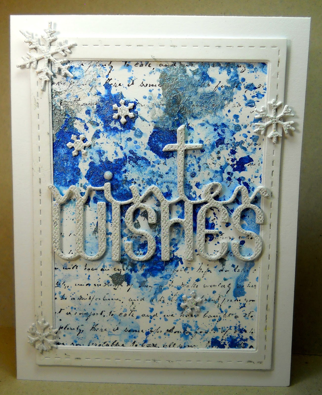 Out of slightly glittered cs, I die cut some small snowflakes and the "winter wishes", making three layers of each and sticking them together for dimension. I lost the little die cut dot for over the "i" in "winter" so substituted a little embellishment.